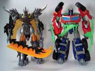 The robot mode is large, similarly sized to Optimal Optimus. The massive wings will no doubt make shelf placement tricky, and the articulation is not bad. The joints are clicky, ratchety affairs that don't seem to have to fight a losing battle with gravity. Due to the figure's massive 7-inch sword, this is essential just so he can carry his weapon in his hand. We rarely see this sort of quality, and in some respects it might be a better toy for collectors than for kids. After all, the loud clicking when you move most of the joints can be a little nerve-wracking. After Metroplex, it seemed that we had a sort of a gold standard set for the big toys. This figure and the matching Optimus both make arguments for possible simple and cheaper toys of unusual size.