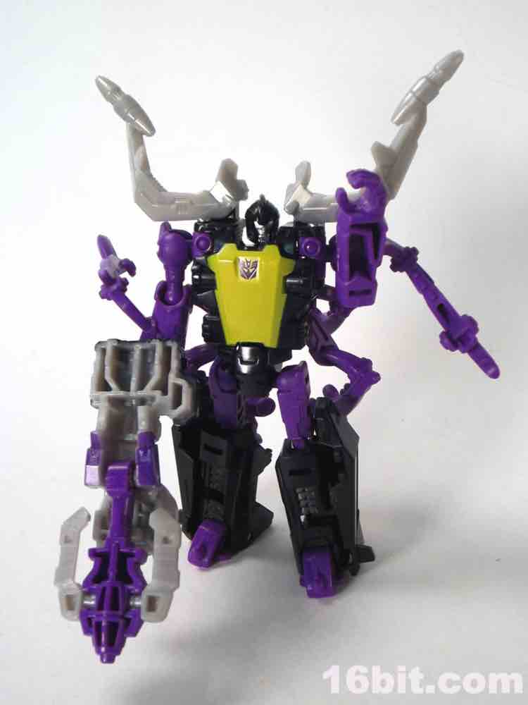 The stag beetle mode measures nearly 5-inches long and basically looks like a robot bug. There's gold, grey, purple, and black without much of a head. There's a void of where a head should go in the area with the mandibles, but it more or less looks OK. Since I assume most collectors will display him in robot mode, this won't matter much. I would have preferred a bit more in this area.