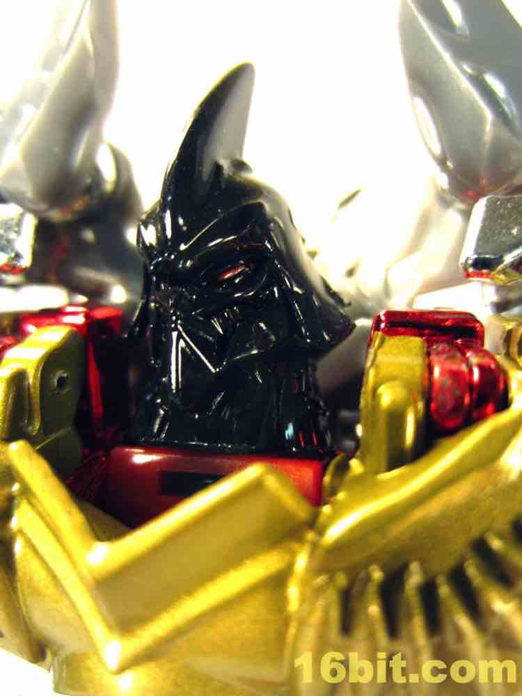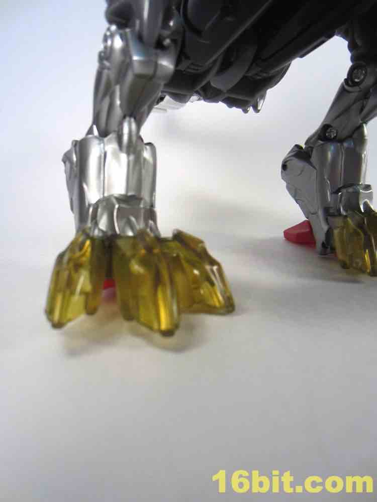 One of the most clever - and surprisingly effective - features is in the T-Rex feet. Instead of gold chrome, a clear, murky yellow was deployed and it's shockingly pretty. I want to see more of it - while the red loincloth, well, I could do without that. The red chrome eyes look gorgeous, and the red chrome crotch is probably not going to age well if you ever transform this toy.
