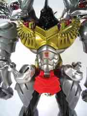 Multiple redecoes of this mold are out and about now - even in G1 colors, Japan has a different one. The end result looks a little like the original G1 toys in color, but that's it - the original Grimlock didn't have a chrome head, or a black club, or chrome pointy-toed shoes. The flavor is definitely here, and the 7 1/2-inch tall robot does look really cool. Hasbro applied a ton of paint to this guys, from tampos which resemble stickers to red chrome which, I assume, is going to flake and look terrible in 15 years.