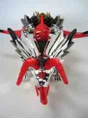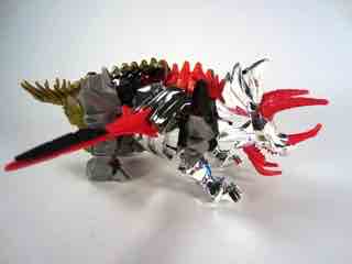 The silver frill and golden tail are present, but the rest of it is a mishmash of new and old parts. Silver forelegs and a dinosaur body to match are unique to this design, as is the red articulated dinosaur jaw. At 7-inches long, this is a decent sized beast. It doesn't have a lot of visible tampos like Grimlock that evoke stickers beyond the Autobot sigil on his head - other than that, it's basically a mutated triceratops with a spiny tail.
