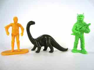 If you're like me, you want this. You're enamored with the concept of the toy soldier, specifically the green army man, and want to see it expanded beyond the military. Dinosaurs are a good fit, and the scientifically (as the kids say) wack designs are charming. If you've got a Battle Mountain or a computer with a decent monitor they make great decorations, plus they're reasonably fun and cute. Nobody is going to argue these are beautiful and perfect models, but how many made-in-the-USA sacks of dinosaurs can you get out there these days? The J Lloyd International/Tim Mee/Processed Plastics lines of reissues continue along nicely and quietly, but most of all cheaply. The bag isn't exactly high-grade stuff and the paper label doesn't feel like it will hold up to a lot of abuse. Get yourself a set, split it with your kids, or your trading buddy in Portland.