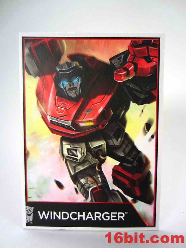 I'd like to take a moment to pick on the packaging. As you can see above, this toy - and indeed many of the Combiner Wars toys - have nifty illustrations on the cardbacks. These are low-res, and you can see the individual pixels easily with the naked eye. It's tougher to see in a digital photo for obvious reasons. It's not unique to Windcharger - most of the new guys seem to have this problem in Generations while Robots in Disguise has very nice, very clean art. I should also note that the art is similar, but not identical to, the super-thick trading card in this package.