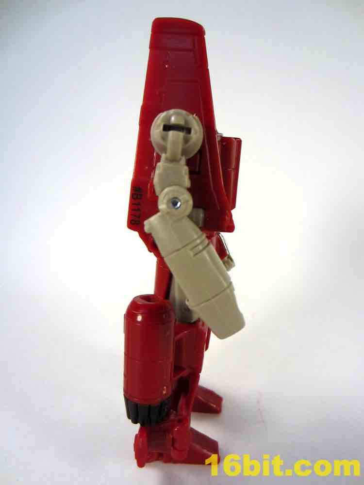 Transformation is a little tricky, thanks to lining up the tabs and slots on the wings. Also, the legs don't peg together especially well on my sample, so this figure tends to look best and be most stable in robot mode. The plane has retractable landing gear and little else in the way of moving parts, but what's superbly clever is the landing gear looks good and doubles as the grip of the gun mode. I would like to shake the hand of the designer that came up with this one, because it's just peachy. Getting all the panels to line up and tab into position is surprisingly tricky, especially when compared to other recent toys in this scale. The slightly softer plastic doesn't seem to be helping too much either, but you get an adequate plain that's a little on the plain side. Reprolabels will probably add some wing decals later.