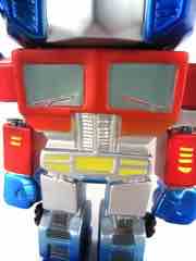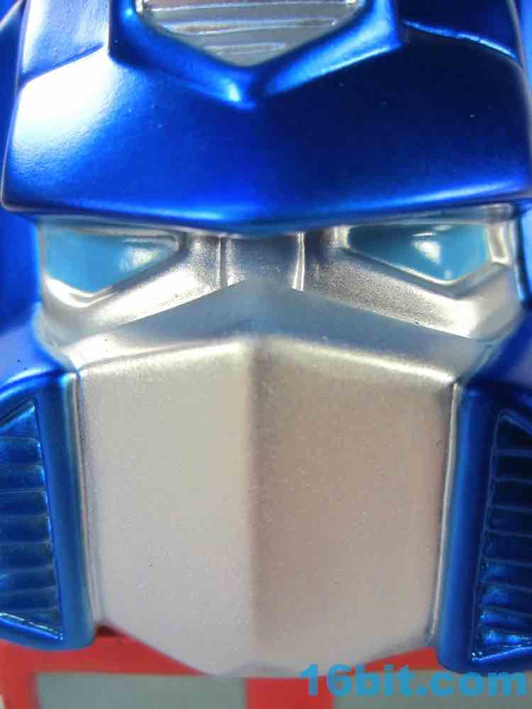 There are no fewer than 8 or 9 of these - maybe more - and there were a bunch of exclusives too. Being dull, I just got the regular metallic one. The red is a matte finish while the silver and blue shine like the dickens. Under bright lights, it's stunning. It sings. In my basement on my desk, it merely looks good. Light makes a tremendous difference, as it better highlights the blue to silver fades and the yellow highlights on the front of the figure. The deco is very similar to the Masterpiece Optimus Prime (and Convoy) toys in that you get the yellow wrist markings and blue eyes. (The yellow markings are relatively new, as is the blue crotch stripe running under his torso.) Sculpted detail isn't necessarily remarkable, but there are a bunch of panels and grooves on the helmet that look pretty amazing. The body is largely simple, but it works. You see some faux joints and of course long smokestacks, because safety problems are less of an issue on vinyl collector figures sold to spoiled adult man children.