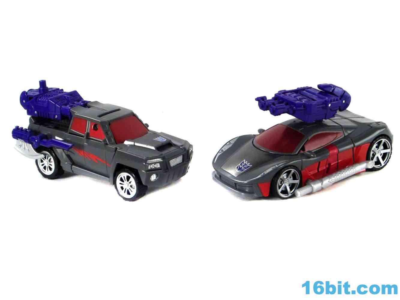 As a car, Brake-Neck works as a great combination of Offroad's colors on Dead End's chassis. No obvious mold changes were made for this car, but you do get niceties like painted wheels, headlights, and that silver hood for some reason. The red stripe of Offroad's, er, "bolts" is now an enormous red stripe which blends in with some unpaintable red plastic that is a bit of an eyesore in this mode, but it's not a problem from where I sit. The exhaust pipe weapon plugs in to the side of the car - it's the same one Dead End got - and the Decepticon symbol pops nicely as do the red windows. For a same-mold figure, it's a good one.