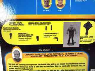 The pants are glossy and bland, but decent. Andrew Robinson's make-up is replicated fairly well, plopped on a body with articulation just below the norm for this line. There's no waist joint, but there are 11 total joints and because of the long shirt, Garak won't be doing any sitting - the articulation helps him stand on a shelf or on the included Cardassian display base. Since it was the 1990s and toy companies felt shame when there were problems with figure/vehicle compatibility at times, this one works well. The phaser fits right in his hand, as does everything else in the package. Each accessory is cast in a nice blue color, which looks absolutely nothing like any of the props on the show - the forms are right, but the colors aren't even close. This was normal for Playmates in the 1990s, as you'll see wacky colors on Teenage Mutant Ninja Turtles as well. Things were a little better in seaQuest DSV, but you still saw bright orange gear with some figures too. The trading card is also nice, a common pack-in of the mid 1990s as nice, cheap paper was a strong selling point and things like exclusive cards or promo cards helped to cross-brand with SkyBox or Topps or another manufacturer. Playmates frequently jumped in with other manufacturers and products to get the word out, but today the card has a lot less weight than it did 20 years ago. After all, 20 years ago people more frequently purchased trading card packs and they were a heck of a lot cheaper.