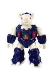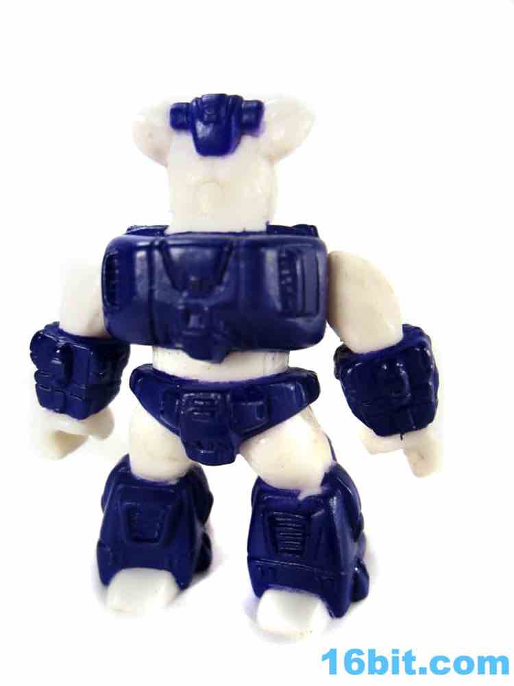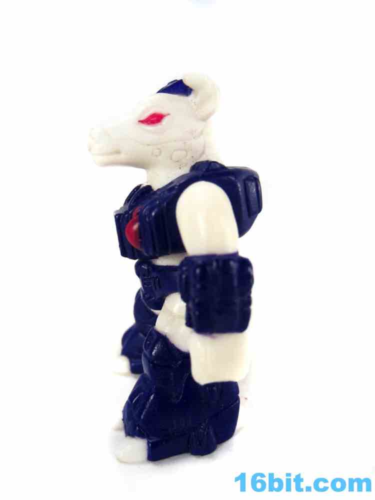 Molded in white plastic, this one doesn't have as much paint as you might hope. Sure, it has red eyes and blue armor, but no black or brown spots. You'll notice grooves in its skin indicating where those kinds of markings could go, but the toy budgets of the late 1980s gave us wonderful things like toy lines with very few repaints. Small figures with low articulation were popular, so that's what we have here - an albino bovine created deftly enough for general heifer-interested junkies. Sure, the horns are unpainted and white, but this line had a green rabbit in the first wave and if you can deal with that, you can deal with the weird claw-like hooves and awesomely robotic armor. The quasi-Transformers aesthetic is just gorgeous, with that perfect feel that's hard to put into words.