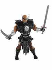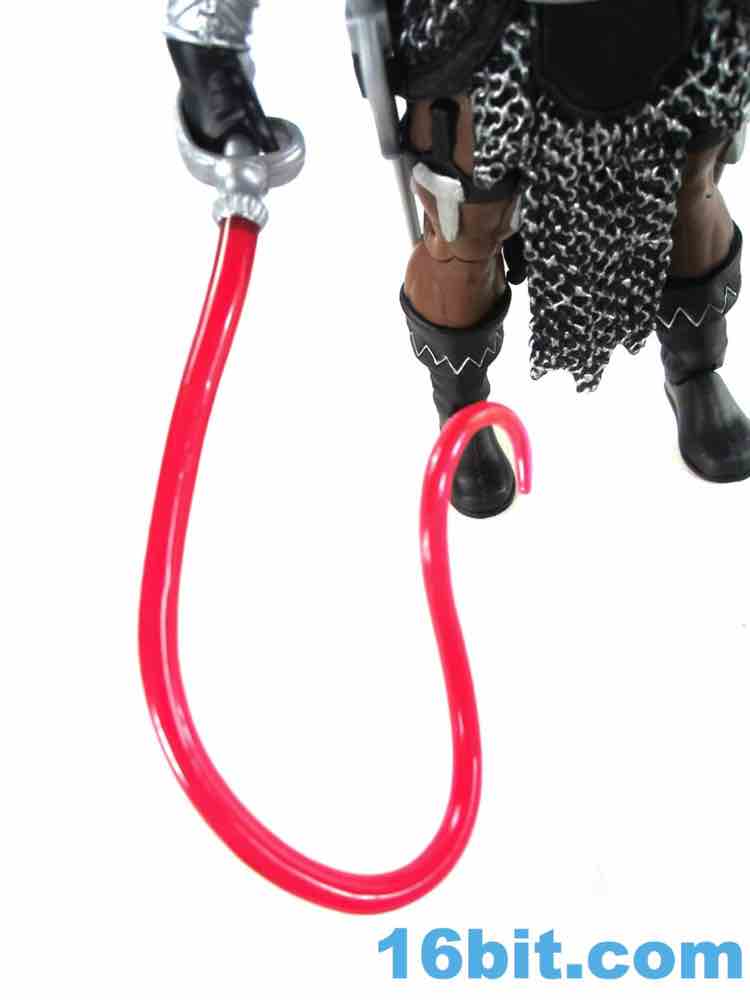 The standard buck is back with some nice enhancements, particular on the boots and vambraces. The chain mail body outfit is really nice - the chains are painted silver, but are molded in black plastic to give them some decent depth. There's a silver face on the armor, plus his head gear looks a lot like the movie - heck, the scar is much more exaggerated on the toy. Like Jitsu, it's a nice figure where you can see a lot of the work going in to all the blades on his shoulders, his "ears," and the two giant swords which slide in slots on his belt. Clearly, this is a man who likes his blades. And, for some reason, a whip. It doesn't quite fit in with the naming convention, but whatever, it looks cool and fits in his hand with a bit of a fight. It even has a thumb guard! The swords are a tight fit in his hands, but they fit in his belt loops like a glove. Mattel and the Four Horsemen put a lot of effort in making this one look great, and for reasons I may never fully appreciate.