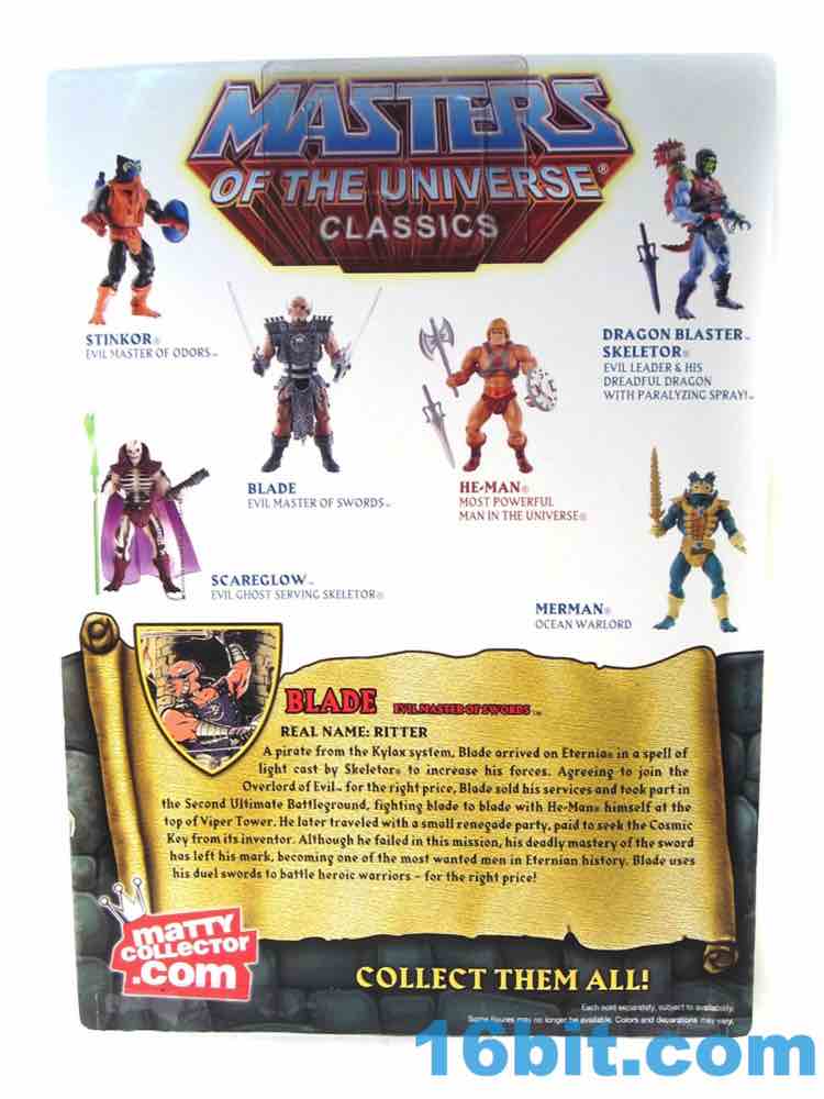 Standing tall and proud, the figure's not-entirely-inhuman face doesn't match with his bulked-out body and armor. It looks like a person wearing a MOTUC suit, complete with chin spikes and ear swords. It's almost better than most 1980s figures - certainly an improvement over the original Blade - in that it takes the thematic concepts introduced by the name and extends them to their logical conclusion. Which is to say, swords everywhere.