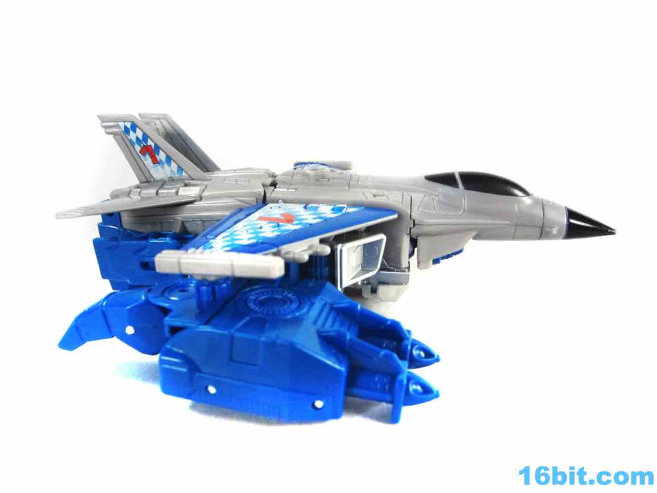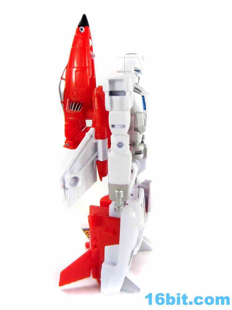 I'm very fond of Air Raid, now a blue jet with a mostly white and silver robot mode. Now, which gun is his? Good question. The official shots shows him holding the blue double-barreled gun. However, he is boxed next to the grey one. The original 1994 toy had a black pistol, so I really don't know what to tell you there - I'm giving him the blue one because it blends in less. The robot itself is pretty sharp, with loads of silver and white. The tiny G2 Autobot logo on his shoulder is terribly small, but at least it's present and colored consistently with his teammates. The toy has the exact same articulation as last year's Air Raid [FOTD #1,159], and feels a little less snazzy than that original release.