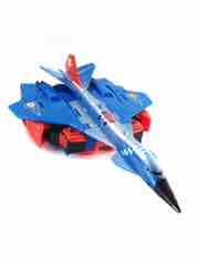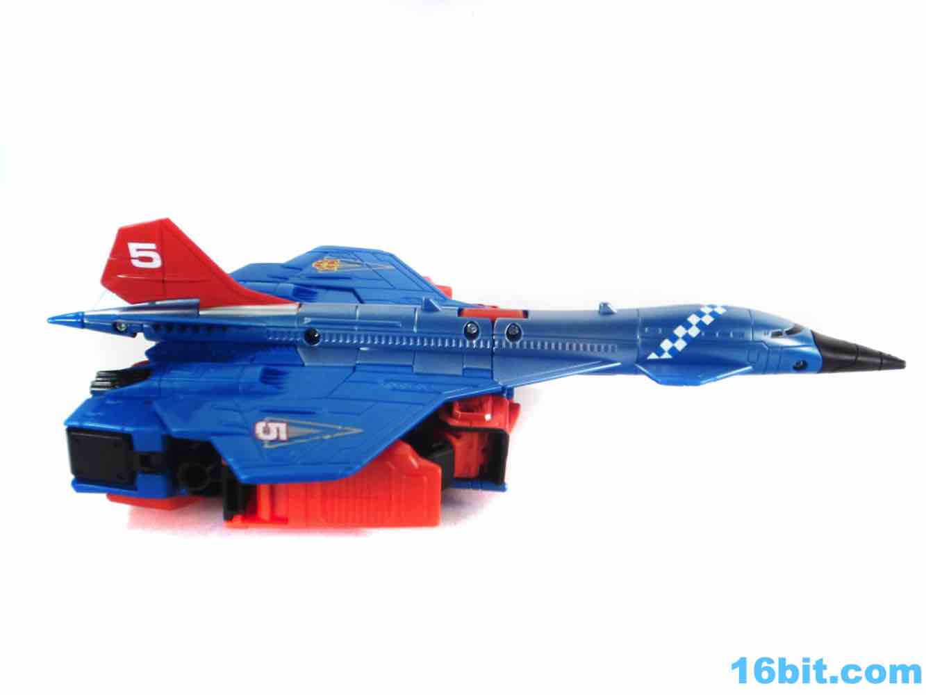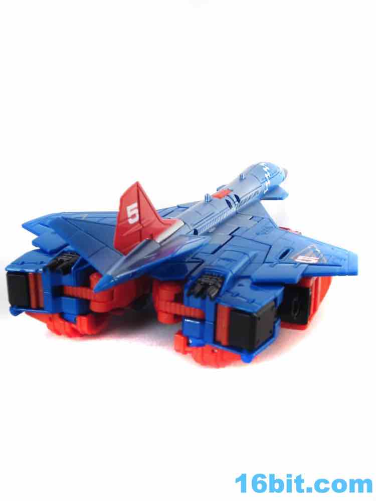 The biggest figure in the set is Silverbolt, and he's just as good as last year's G1-themed Silverbolt [FOTD #1,210]. There's still a lot of red on him, but the level of blue gives me a "Powered Convoy" vibe. Articulation is good, the gun is still black, and I'm actually kind of hard-pressed to say much more about it. This all feels very superficial, but the main differences are color and the jet deco. A couple of "5" marks resemble the original toy from over 20 years ago, and a checkered stripe across the "neck" is pretty slick. A metallic silver dusting also brings a lot of life to the jet mode and, sadly, is completely invisible when combined. It's nice to see Hasbro put this much effort in to the toy, complete with cool triangles on each wing, but what really matters is the torso mode. It's great. Gold eyes! Gold antenna! It's G2licious. On the back of the box he's assigned the number 1, which is unfortunate but whatever. Some people miss an opportunity for synergy, as the toys are rarely numbered themselves most of the time.