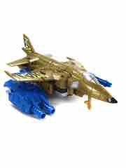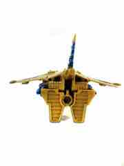 The odd jet out is Quickslinger. This is an update of the original Slingshot, which was notorious for shattering with age through something called Gold Plastic Syndrome, which Hasbro says this toy should not have. This isn't a swirly gold plastic, so hopefully it will hold up to the ages. The jet mode is nice, essentially taking that Firefly body and giving it a silver and gold finish. It's a little gaudy, and it doesn't quite match the rest of the set, but I like it. The wings have a nice tampo with a "4" on it, and these resemble the original toy's labels. These toys all lack the word "AUTOBOT" or "SLINGSHOT" like we saw on the originals.
