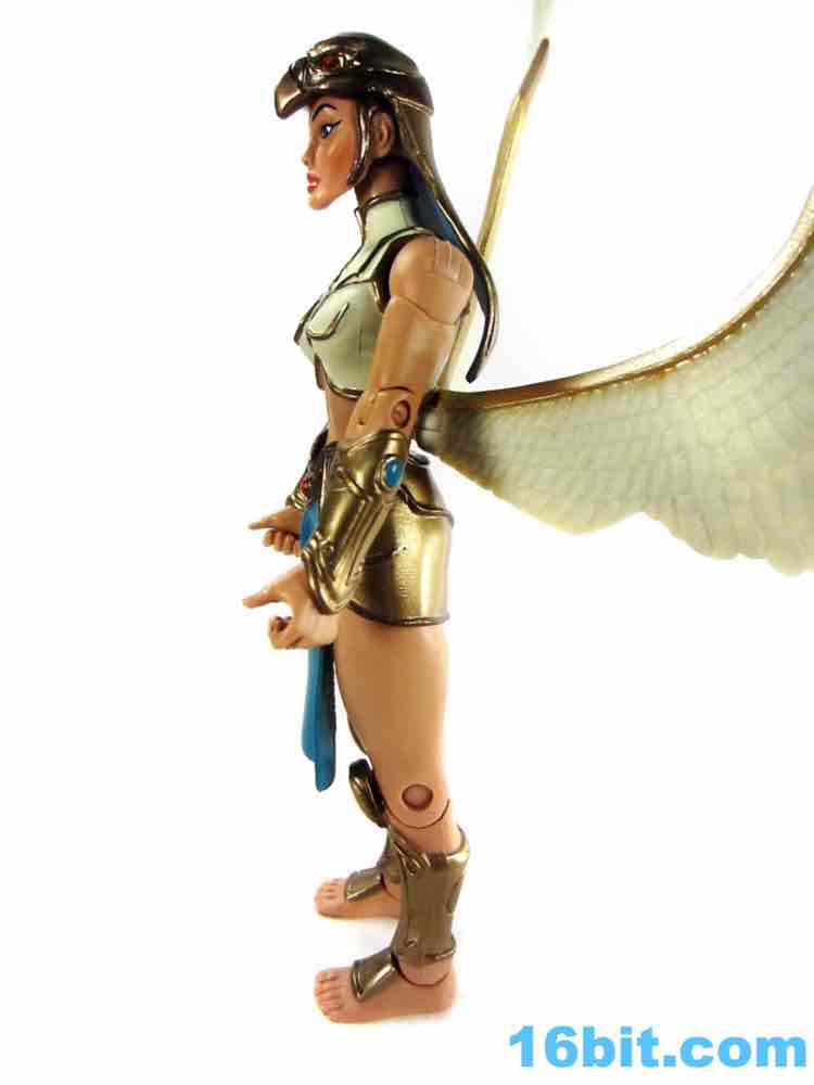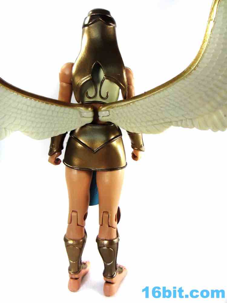 Articulation is really nothing special - if you have any other figures from the line, this is pretty close to them. Jointed ankles and a swivel waist are nice, and the arms have the same great movement you're used to at this point. Of course, the arms are sort of held in a certain pose or two thanks to a blue shawl accessory that, well, they tried. It's not very good. It doesn't "hang" well unless you spend a lot of time bending it and twisting it so the wings hold it in place, but the sculpting is great and the color is good. I don't doubt that it was anime inspired rather than The Incredibles-inspired, notably because Pixar's film mocked capes and their deadly attributes after this particular chapter of He-Man came to a close. So it just sort of dangles there... it gets in the way if you're playing with the figure and might look better in the junk drawer. Thankfully her wings and their feathers are exquisite, the sculpted feather detail on each no doubt drove one of the Horsemen completely mad. The staff is also quite nice - chunky, old, gold.