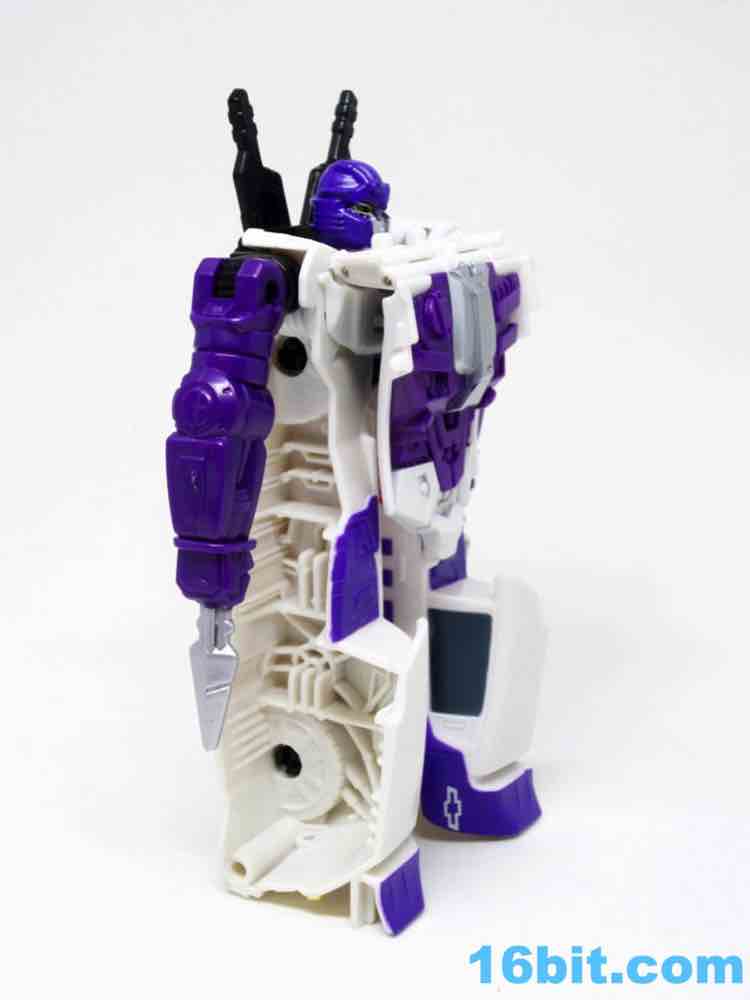 Car is smaller than a deluxe, measuring roughly four inches between each bumper. A nifty checker pattern and a Chevy marking make it distinctive, with an Autobot symbol to let kids know that disguises don't have to be perfect. Its wheels roll nicely and the windows are painted - or rolled down. While there's not a ton of paint here, they really make it count with 4 Chevy symbols and a nice big purple spoiler.