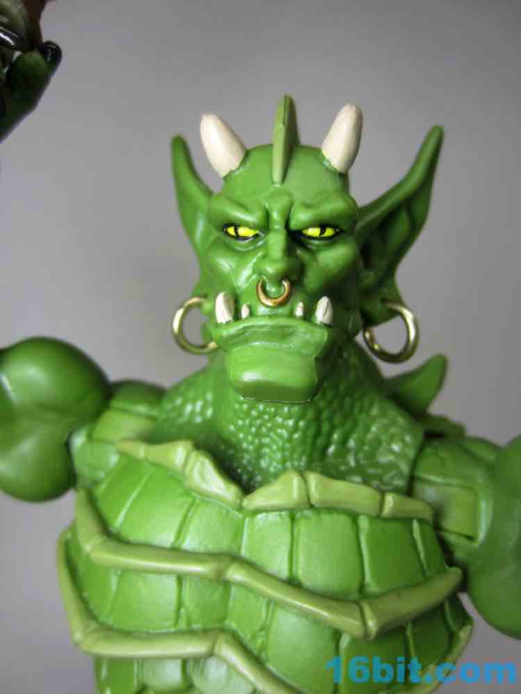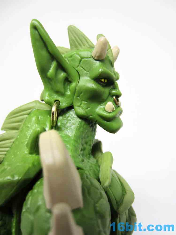 You have to plug the tail in place, and it helps keep him standing. The feet are similar to other figures like Demo Man - clawed, green, and not able to rock. They're good enough for the figure, as, well, let's be honest - you're not going to be doing a ton with this guy. He can stand, and he can stand in other, similar positions. His weapon is some sort of bone-based backscratcher, or at least I think that's what it is. You can tell me if I'm wrong. It's a little loose in his right hand, but it fits - that's what we need. It's also worth noting that a couple of the spikes on the back were bent on my sample, so I should probably dip him in some boiling water and fix those. On the whole, though, he came out pretty much exactly as good as you might want.
