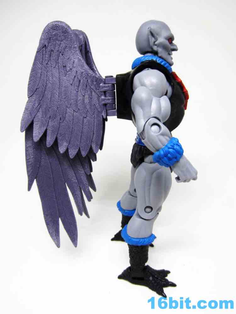 Articulation has nothing you haven't seen, and everything more or less works. The wings are very much like Queen Angella, the feet could make for a great rooster figure some day, and his hands have no problems holding the feathered crossbow or the nifty neck thing. You can totally tie up a dude.