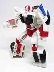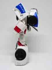 Streetwise' robot mode owes a lot to Prowl, but the paint job takes pains to bring you something colored like the original 1986 toy. A black chest resembles the windshield kibble on the original, and the red accents on the legs are a nice touch too. The robot mode sends the blue bits of the car (which were not on the original) to the back seat, leaving you with a nicely decorated robot. There's a lovely silver face, blue eyes, and a red-striped helmet to make this more than just another white robot toy. Each hand can easily hold his weapons, although the left elbow on my sample does not seem to agree with gravity enough to hold up the handfootgun easily. Streetwise has all the articulation you've seen on other toys based on this general design - over 14 moving parts, or more if you count some elements like the (arguable) double-shoulders. The white-but-not-bright plastic helps show off some sculpted detailing - you should notice a few of the grooves and techie bits even in less than optimally lit situations.