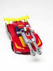 As a kid, I went after Hot Rod over Rodimus Prime because I loved the car mode so much - and the new one is cool too! Maybe not as cool, but it's pretty sharp - the lack of sticker detail is obvious from the outset, but you've still got the clear blue windshield, teh flames, the oranges, the reds, and so on. The chrome pipes are now grey, which is probably for the best given how vac metal can hold up these days. I'd rather not have something to flake off. (Maybe Japan will give you chrome if you crave it.) His wheels spin adequately, and the spoiler - painted rather than molded yellow - looks pretty good too. I like this one slightly more than the "Classics" mold, but your mileage may vary. I assume the best version is yet to come, and/or will require modifications from a sticker sheet.