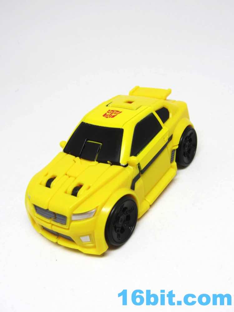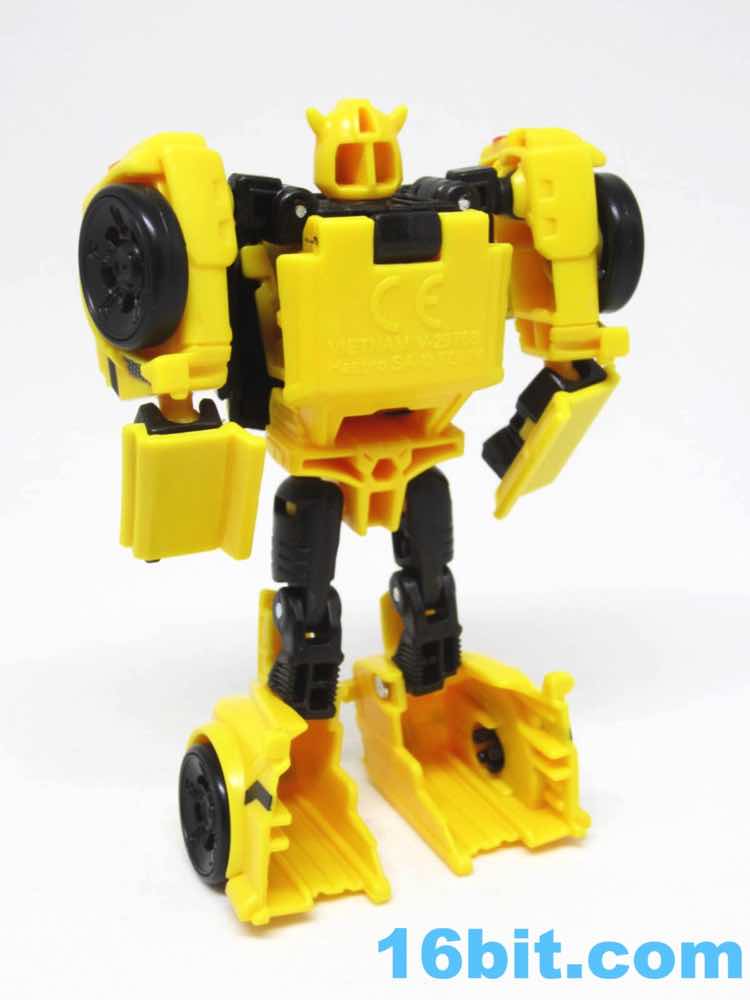 The car is more or less a typical non-VW Bumblebee, with a little spoiler plus painted lights and grille. What really struck me with this figure wasn't its boxy-yet-sporty design, but the license plate. It's sculpted "100STRA" which I am told is probably a nod to movie Bumblebee's license plate. I'm not particularly studied on the films, so there you go. Its windows are black and the wheels seem to roll quite nicely. Deco is good, but not perfect - the yellow paint on the area surrounding the top of the car is painted yellow, and isn't a great match to the molded yellow that makes up the rest of the car.