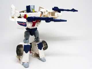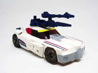 This 1.5-inch Autobot Throttle is a robot-to-head rather than a robot-to-engine. The colors don't match up at all, and the sculpting doesn't really either - after all, the entire axis of Throttle/Breakaway recycle parts of the previous Blurr and Chromedome toys. The coloring of a blue-armed white robot doesn't at all match the grey-bodied red-limbed original, but it performs its tasks well and has little deco other than the face plate. It fits in the car nicely, because it had previously.