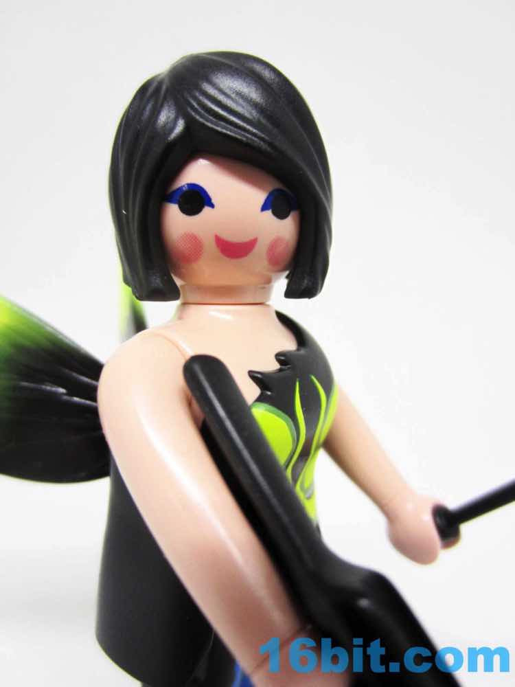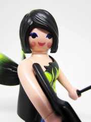 As with all of the blind bag Playmobil figures, assembly is required - normal figures don't require you to plug in the arms, legs, and head like the bagged ones. This one adds a step of plugging in the wings, which I should note are a manufacturing oddity in the toy world. If you collect records, you know swirled color vinyl isn't unusual - it means no two records are exactly alike, and this sort of technique isn't to common in toys. Here, day-glow greenish yellow has been smooshed with black to make a set of wings that really pops nicely. If you have a black light, this figure sings.
