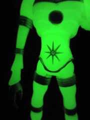 The larger figure is a lot like the previous versions. It's actually exactly like them, except for color - you get 16 plastic pieces you can pop apart, including his two weapons. The weapons are cast in clear colorless ABS plastic and painted silver - although some clear bits poke through - while the PVC is all glow, and matches the other Cosmic Radiation figures quite nicely. Silver highlights were added to the figure, which probably would have been just fine in unpainted glow plastic. Silver claws, joints, belts, and ornaments were added to make him pop - the silver chest really adds a lot to the figure, and I would not have expected it to make a big difference. The glow plastic is a wee bit translucent, so bringing the figure's body into the land of the tangible is a nice touch.