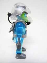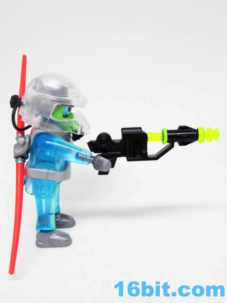 The figure's weapons are all pretty cool. A classic ray gun is molded in black with a green emitter, complete with 1960s-style discs at the end. Its clear green sheen lights up like the dickens under a black light. The warrior can grip it by the top, or hold the grip - I like the options, it's nice that he isn't required to be aiming it at somebody at all times. It can also mount on his back. Most surprising of all, to me, was a double-bladed red Darth Maul-style lightsaber. The hilt is different, but the whole thing is made of a fairly soft and flexible plastic which the figure has no problems gripping. As an added bonus, there's a clear green wrist communicator bracelet. This is a well-accessorized figure for the money, arguably as good or better than the blind bags.