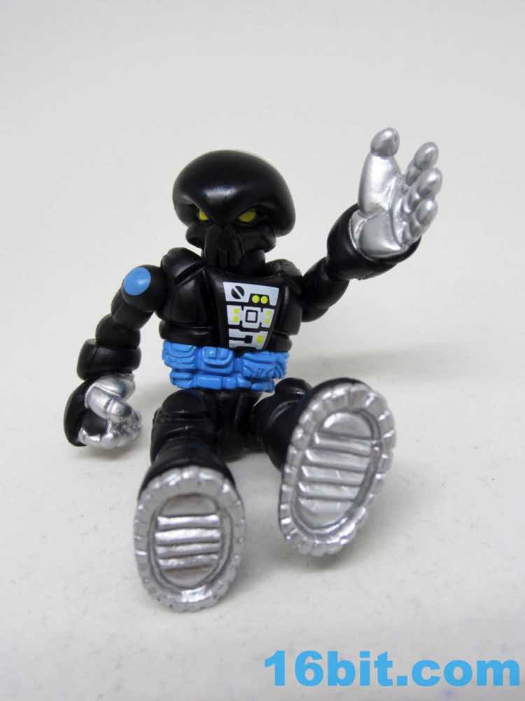Molded in black, Pheyden takes on new personality when given bright yellow eyes. A silver stripe on top of his head recalls the motorcycle helmet's visor on Clawtron, as that Fisher-Price Adventure People figure was basically some dude molded in black with claw arms. The blue markings and belt are very similar to the original Clawtron toy, and the ornate white box on his chest is a remix of the pattern from that classic 1980 action figure.