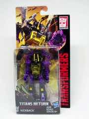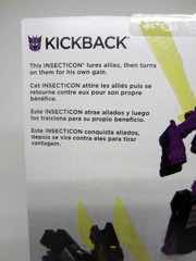 The long-awaited Titans ReturnKickback is, months after its release, still in short supply. I haven't seen one in the wild yet - I got mine online last year with Bumblebee and Gnaw. The last of the original group of Insecticons, Kickback comes years after Skrapnel and Bombshell - and in slightly different colors, with a different aesthetic. They still look good together, but it's clearly a different toy from a different era. This is the only one of the three bugbots to feature clear plastic, for example, retaining a key element from the original toy in a window on the figure's back. This allows you to enjoy a rumble seat for your Titan Masters figures (sold separately.)