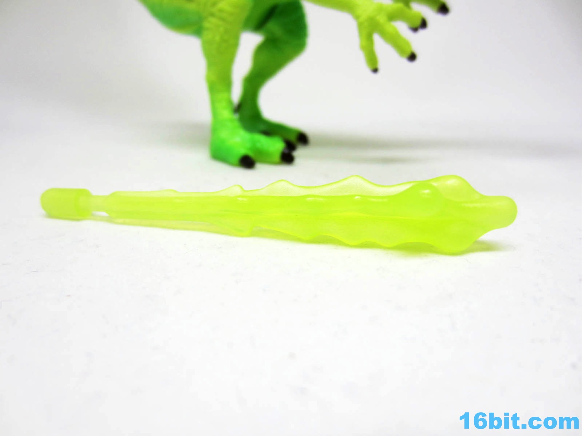 The main gimmick on the toy is poison toxic yellow phlegm in rocket form. It fits in his open mouth and shoots a short distance when you move his tail. It works. It looks goofy. Your kids, they're going to love it. If that weren't enough there's a light-up open wound where if you push on his meat and bones, it screams. I have the same functionality.