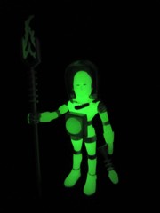 It's worth noting that the original Alpha Phase Electron+ [FOTD #258] had painted silver eyes just like this new one. That was also the only paint it had - the 2017 version has painted silver rings, hoses, and the most surprising addition to me was the painted fingers. It adds a bit to the figure's look, giving it a slightly more grounded look than the ghostly original. The accessories are painted silver, but cast in glow plastic - note the "electricity" on the staff, the tip of the blaster, and the central disc on the chest. These are all glow-in-the-dark ABS plastic, while the helmet was cast in clear colorless plastic. Clear colorless accessories (and glow helmets) were also produced, but it isn't 100% clear how they will be distributed. I can tell you I've got samples of them, though, and they're cool.