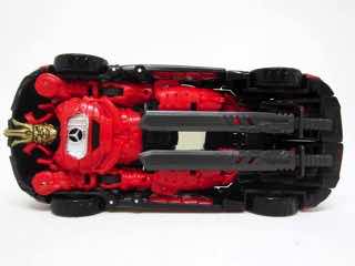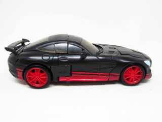 His four swords seem to be the same as the previous Deluxe toy, but cast in black. I can't find any obvious differences in them, aside from the black plastic feeling a little more flexible than the gold plastic. You can plug them in all sorts of places - his hands, 5mm ports on his back, and under the car in vehicle mode. The little swords tuck inside the car perfectly, while the big ones drag along the asphalt. Everybody did a bang-up job here.