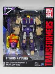This 1.5-inch robot Titan Master Hazard is Doomshot with a new face backpack. It looks sort of like a tiny Blitzwing with no paint and five points of articulation. What I love is that Hasbro did a nicer job integrating places for him to sit in the vehicle modes - the jet cockpit has a good seat, and the tank has a perfectly acceptable position on the turret. The figure can stand or sit, or serve as a head to the larger Blitzwing robot mode. You get what you want here.
