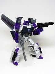 Decepticon Octone is a pretty good update - you get some features you wanted, and some you didn't want. Vestigial Optimus elements include spring-loaded pop-up ear antenna, plus the shoulder stacks which weren't part of the original toy. Otherwise, the robot is pretty good and has been decked out in somewhat fragile foil stickers that do not hold up to simple handling, let alone rough play. I hope Hasbro abandons stickers entirely. I like that the face and overall build captures the feel of the original toy with things like hip joints and better arm movement, plus it stands over 7-inches tall. There is no tail fin weapon, but you do get a decent rifle and G2 Laser Prime's double-barrel cannon thing. The generous application of color through stickers is most appreciated, and this is probably the best of the three modes.
