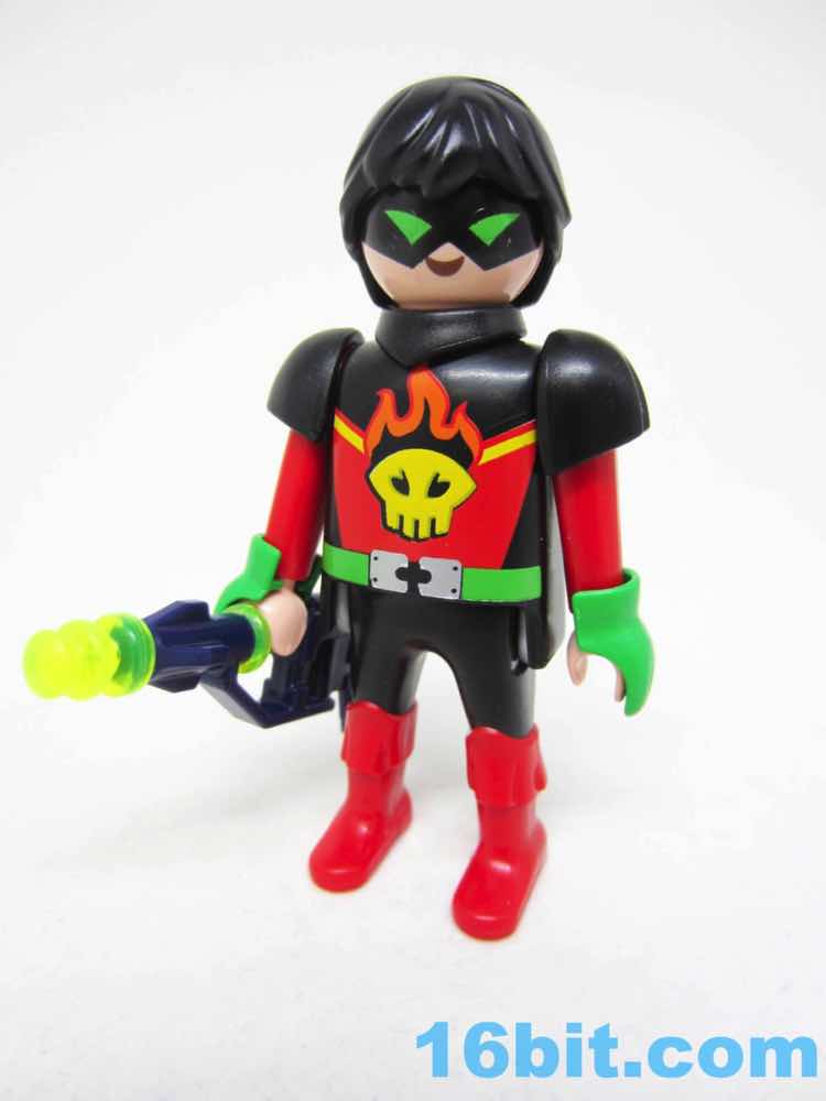 Playmobil's homegrown superheroes are neat, mostly because you can smell traces of other characters in them. I smell a tiny bit of Robin in their Flaming Skull figure, which has no name anywhere so let's call it that! He's mostly red and black, with green gloves and a green belt, plus green eyes in his mask. The head has inset molded eyes and a mouth, all painted over to bring you the superhero charm.