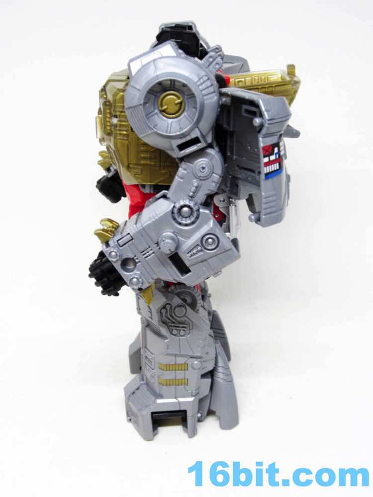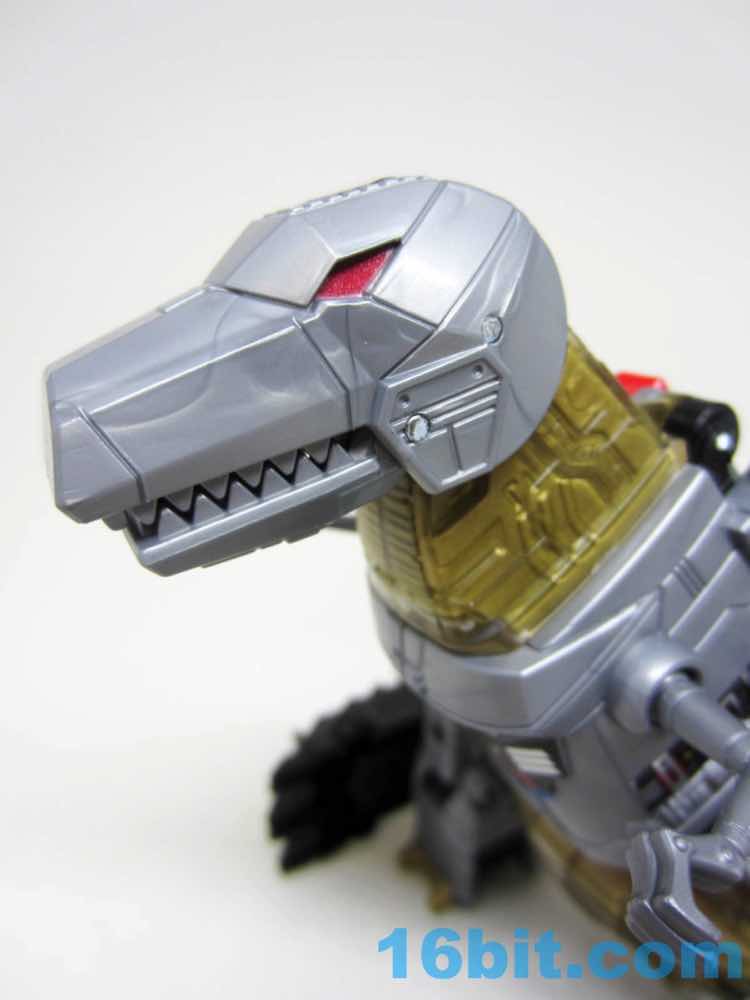 The robot mode is pretty good, considering the limitations imposed by his function. He has to be a torso, and a dinosaur, and a freestanding robot - so the fact that he looks a lot like G1 Grimlock with a bigger chest is pretty amazing. The torso splits so he can transform, and it's a little ugly. With double-jointed elbows and more than a little kibble, it's a definite improvement over the original robot in terms of mobility and size. I love the toy-like head, and the Popeye-esuqe arms are a nice touch. I'm not crazy about Hasbro's newfound love of foil stickers on Leaders and Voyagers, mostly because the quality is poor and they peel before you even open the box in some cases - and I don't know what kind of adhesive to use to reglue them. Deco is good, the clear plastic torso with gold paint underneath is pretty - and probably pretty fragile over the long run. We shall see.