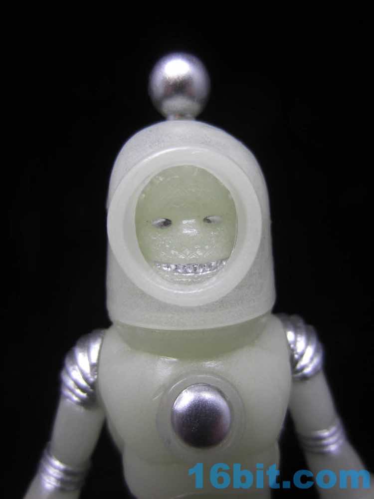 The Man from Alpha Centauri was based on an unproduced Colorforms benadable figure from nearly 50 years ago - it would have predated a rotating face gimmick on Man-E-Faces and other action figures to follow, while giving us a reptile face, an ape-like face, and what I would basically just call an alien face. In bare glow plastic they're difficult to make out, but the silver highlights added to this addition help them to stand out. The alien face has a silver border and tiny eyes. The ape face has huge eyes and a big silver grin. The reptile has a toothy smile and scaly skin. They stand out.
