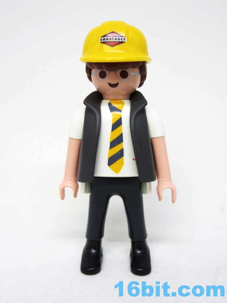 The figure is a pretty great white collar middle-class dweeb. Glasses, short sleeve shirt, IKEA-colored tie, and a vest with a briefcase. This might be a 1950s IBM employee. His silver rimmed glasses look a bit like mine, actually, with a bright yellow hard hat reading "Construct" on it. I love this detail because it looks like it could be a licensed brand or logo, but it's just some thing they made up. It looks great. As always he has six points of articulation with nicely integrated wrists.