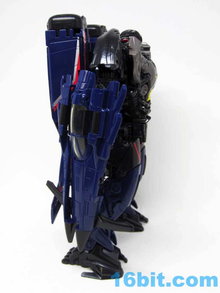 The plane is a plane. I love that you can open the cockpit and plop in a Titan Master or Prime Master robot. If Hasbro did little humans, that'd be even cooler. There's a landing skid that folds down, but that's all it really does. It looks cool, I love the dark blue, and the Decepticon faces on the wings fade in because they're so dang dark. Red and silver stripes may remind you of every Thundercracker ever (minus Machine Wars and Action Masters) with just enough color to be interesting. It may not be realistic, but it's pretty.