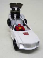 The robot mode is basically Windcharger with a new head. The white toy has painted white bits and some molded blue bits to leans heavily on the original toy's design, with a few modifications. The chest sticker is missing, but the other central details are all here from the silver face to the Autobot codpiece. The blue eyes are a departure from the original G1 toy, and it's a curious choice since the character usually has a unified blue visor and not separate blue eyes. The chest could benefit from a little more color, and I assume that ToyHax will be cranking out labels in the future.
