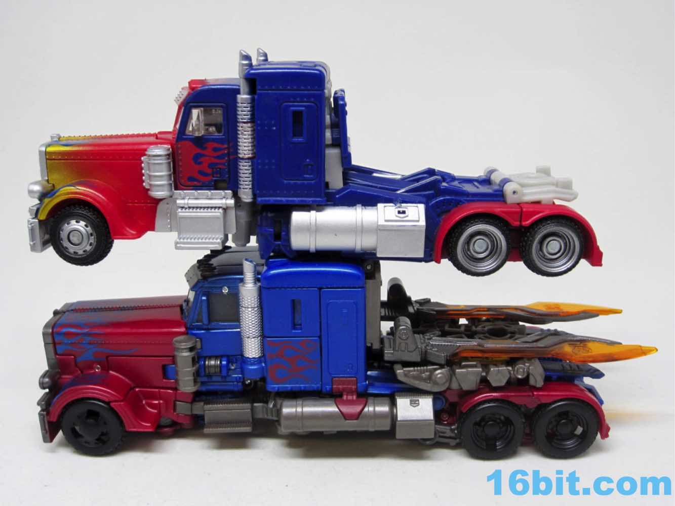 There's no getting around the fact that the truck is small. The new 35-step Voyager toy gives you a truck about the same size as the $10 Walmart exclusive Deluxe Optimus Prime [FOTD #217] from a few years ago. That toy had some more flames, great silver paint, brighter colors, and some added orange on the cab. This one is pretty spartan, and if you don't compare it to other toys it looks great. The sculpted detail is excellent, but the older toy has clear windows, silver paint, and more painted flames. Given the price increase, it would be nice of it had deco parity with the older, dirt cheap toy.