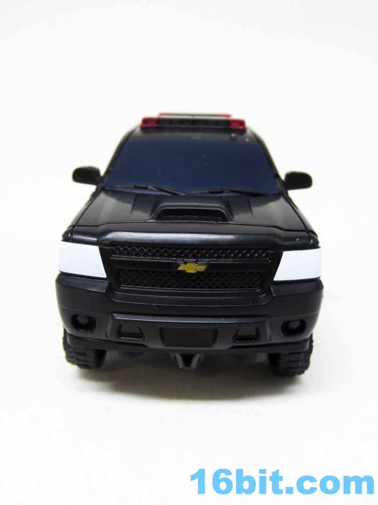 The car is good! The vehicle is compellingly authentic with a Chevrolet symbol on the front and back - painted, to boot. There's a spot for a license plate sticker should you want to add an aftermarket label, and the wheels are unpainted - it matches the Berserker toy nicely as you can see. The red lights on top are a little darker, and the Decepticon symbols are G1 now for some reason. Not just on the toy - but on Stinger, and the packaging too. Starscream is correct for some reason. There's no in-the-car weapon storage as far as I can tell, so they have to hang out on the doors. It works, but it's ugly - and that's how weapon storage is on all of Studio Series so far.