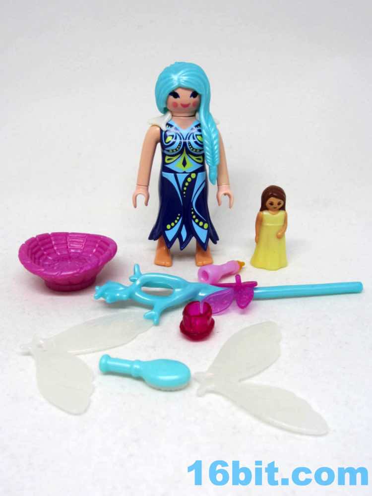 The big figure is standard Playmobil fare with 5 points of articulation, including a nifty lower half with a jagged dress. The pattern painted on the front is pretty stunning, with swirls and dots that may serve as a distraction from the unfortunate lack of a hip joint. She can't stand, but she can hold her brush, staff, or bottle. I'm disappointed they didn't give us a waist joint. The fishtail is molded in a metallic light blue, and she comes with a brace on her back to which you can connect her iridescent wings. It looks like a good figure, but it's going to stand there and hold things. She won't be able to drive a car, which is a downer since Playmobil's big appeal is decades of backward compatibility. Aside from that, she's good.