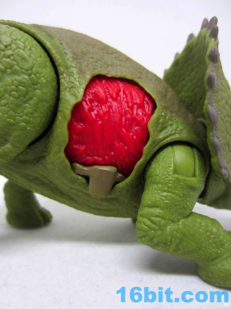 I love the sculpting - the scales, wrinkles, and damage marks are all pretty great. Its horns are molded in a different color and rubbery plastic, which is a nice way to save on paint and to prevent blindness. Deco is very simple compared to other dinos in the assortment. The triceratops' eye is yellow with a tiny black dot, with a painted beak and frill horns. A dusting of brown on its back keeps her from being a mono-color dinosaur like our fathers had, as does some odd cream color on the back of her legs. The red wound under the trap door is molded in red, which is simple and reasonable to expect for a toy like this. I appreciate it's unpainted, because over time it might look ugly with wear and tear. I would have loved painted toes or a wash, but for ten bucks it's pretty good.