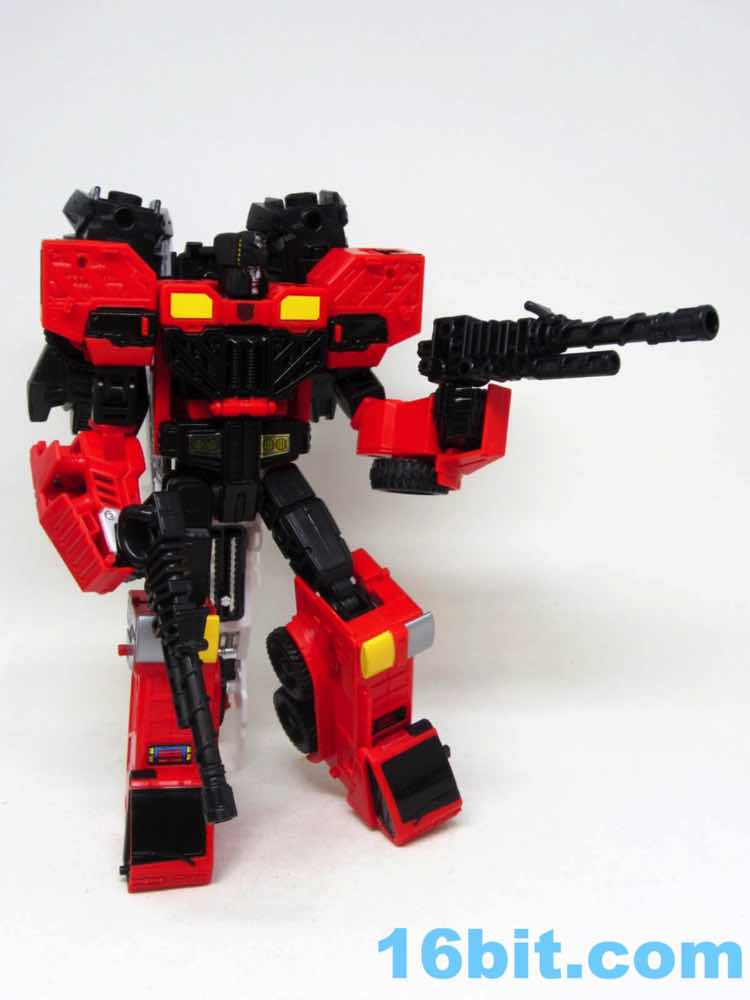 The robot adds some foil stickers that add some life to the figure. The "lights" on his belt shine in the right conditions, and I have to say I have a soft spot for the foil Autobot symbol on the neck. Usually I hate foil stickers, but the factory did a good job applying these in places that are less likely to show wear and tear. The black fists are here, but we don't get that nifty silver tool hand, or the white wings on the side of the head. Other than that, the colors seem to match the original toy fairly well to the best of the existing mold's ability. The articulation is good and it seems the knees are assembled correctly this time - previous iterations of the mold were a bit off - so this is a pretty decent robot. Also remember, the last "classic" Inferno toy was released in 2009.