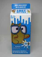 According to the booklet, the big cartons have 24 possible figures - a case of 4 tall cartons could have all 20 in it, but I don't know that yet. The milk carton opens and you slide out a tray with Play-Doh and a figure in it. Each tray has 1 or 2 figures in blind bags, 1 or 2 accessories, and 1 or 2 stickers in wrappers. So the figure is an opaque bag, under a wad of Play-Doh in a tray, in a sealed lid, inside a cardboard box. That's some security.