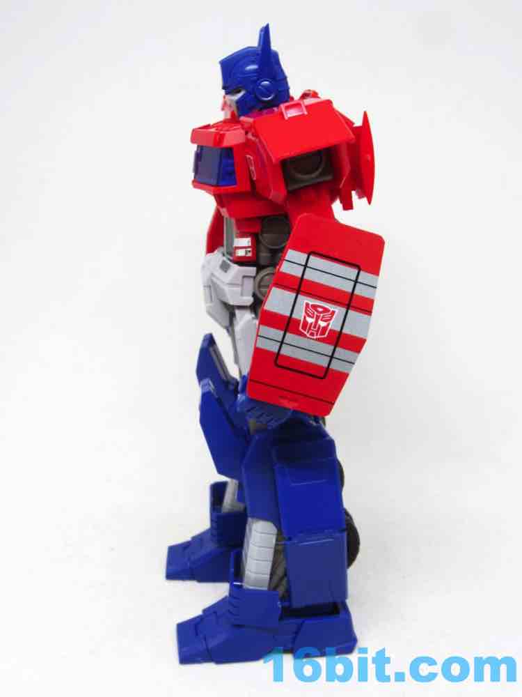 Many of Flame Toys' Transformers kits follow their own original designs, inspired by a pastiche of Generation One 1980s influences and giant, exaggerated thrusting-forward crotches. This Optimus instead conforms to the proportions of the comic books, which puts it squarely on the block-like look favored by Hasbro these days. It looks like it could transform, but it can't - you'll find vestigial wheels on the back of the legs as well as kibble on the back and arms. There is no sig of the smokestacks, but you'll see the truck mode's cab on the chest as well as other elements throughout. It's a real fake licensed Transformers kit, the likes of which I would have loved to have seen Hasbro tackle as a transforming toy if such a thing were to be possible. Articulation is on par with most modern 6-inch action figures, with things like swappable hands, rocker ankles, and lots of arm joints to give you multiple poses and moods for a faceless character. Hands can point, hold a blaster, or be a fist.