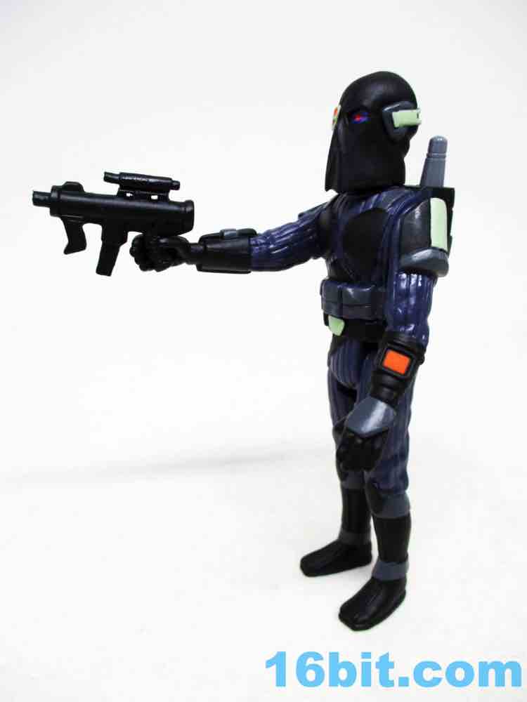 I have little doubt you'll see recolors of this figure for years, and you should absolutely consider getting one. The mash-up of so many old figures in one is just a shining strange little gem. The armor reminds me of Boba Fett - as do the hand poses and jetpack - while the heads look sort of like Cobra Commander and also Peter Cushing. (If this wasn't a Tarkin nod, I'll be surprised.) There's a Lobot-esque wrap-around on the back of the hooded head to the cybernetic eye patch, and the blaster looks like a lot of Kenner weapons from the 1990s. You'll even see a texture to recall Darth Vader in the figure's pants. On the pant legs, I mean. Not... in his pants.
