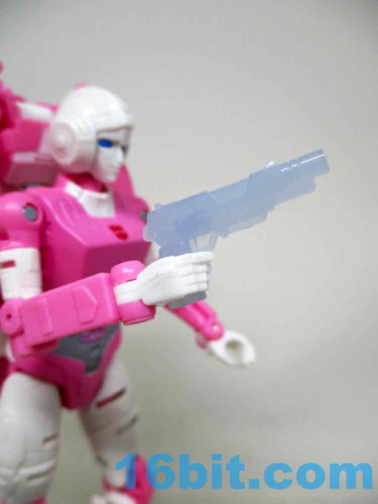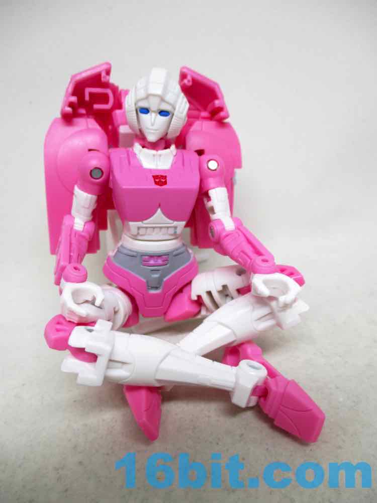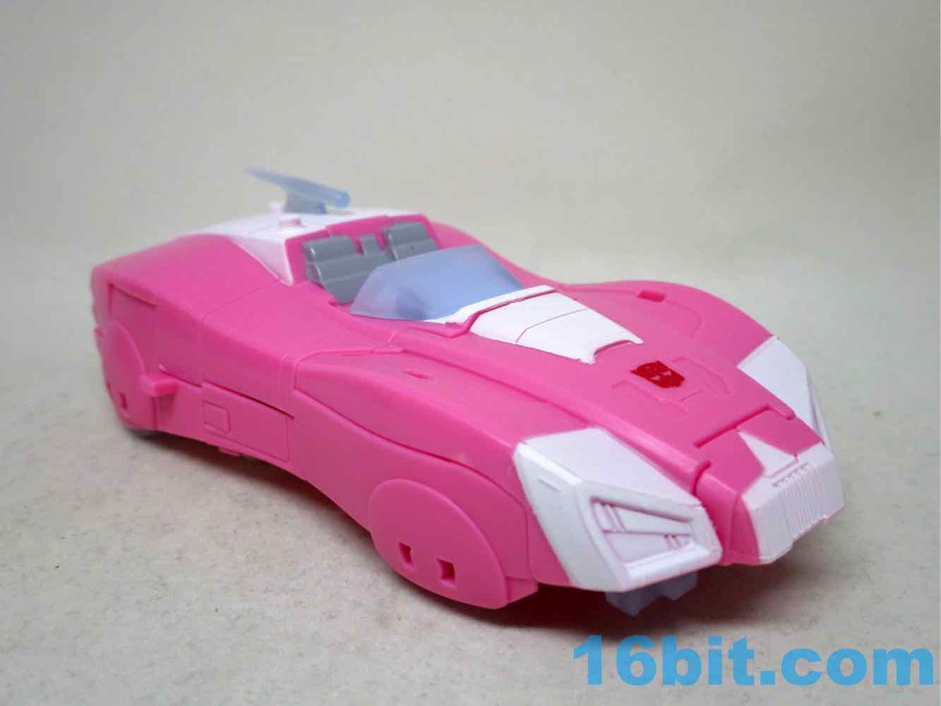 For all intents and purposes, Arcee is a great action figure and a poor "transformer." The robot has a stunning 28 points of articulation, and absolutely none of the robot makes up parts of the car. You can pop off a chunk of her car kibble and use it as a hoverboard, and with the right tools you could knock out a pin and have the complete car and the complete robot standing side by side. Hasbro could just as easily have put out a "pretender" type toy here - and may have saved money doing so.